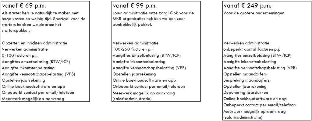 Financieel: Inrichten van de administratie; Verzorgen van de financiële administratie; Samenstellen van de jaarrekeningen; Opstellen van de publicatiestukken en notulen; Begeleiding van financieringsaanvragen; Opstellen budgetten en tussentijdse rapportages. | Loonadministratie: Periodieke salarisspecificaties; Verzorgen loonaangiften; Jaaropgaven voor werknemers; Verzorgen van een betaalbestand lonen (SEPA);Aanleveren loonjournaalpost, verzamelloonstaat; Opstellen arbeidsovereenkomsten. |